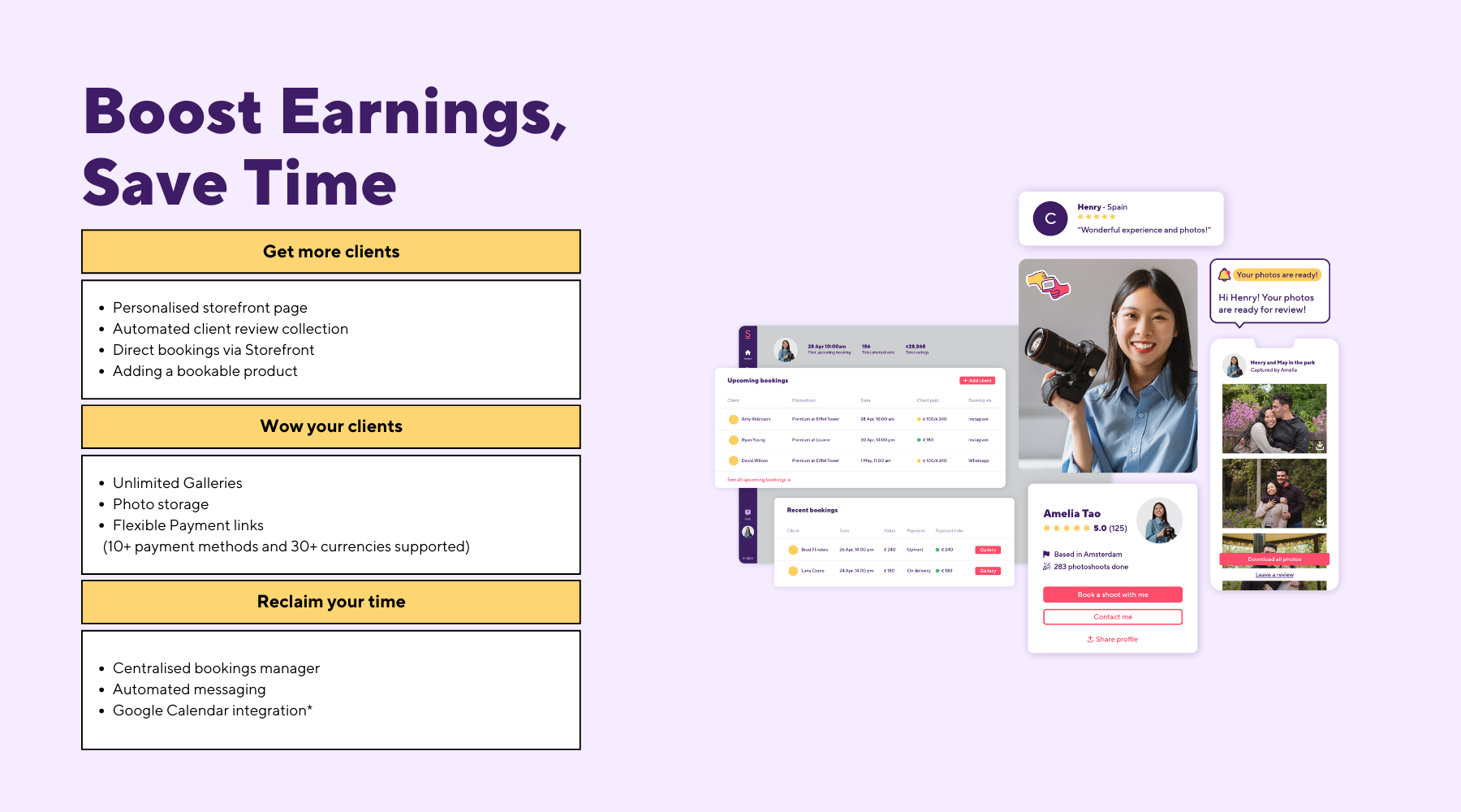 Smiler is the only all-in-one photography business management software that's tailor-made for photographers. If you're tired of juggling between platforms or trying to fit your workflow into tools that just don't cut it, it's the perfect solution for you.